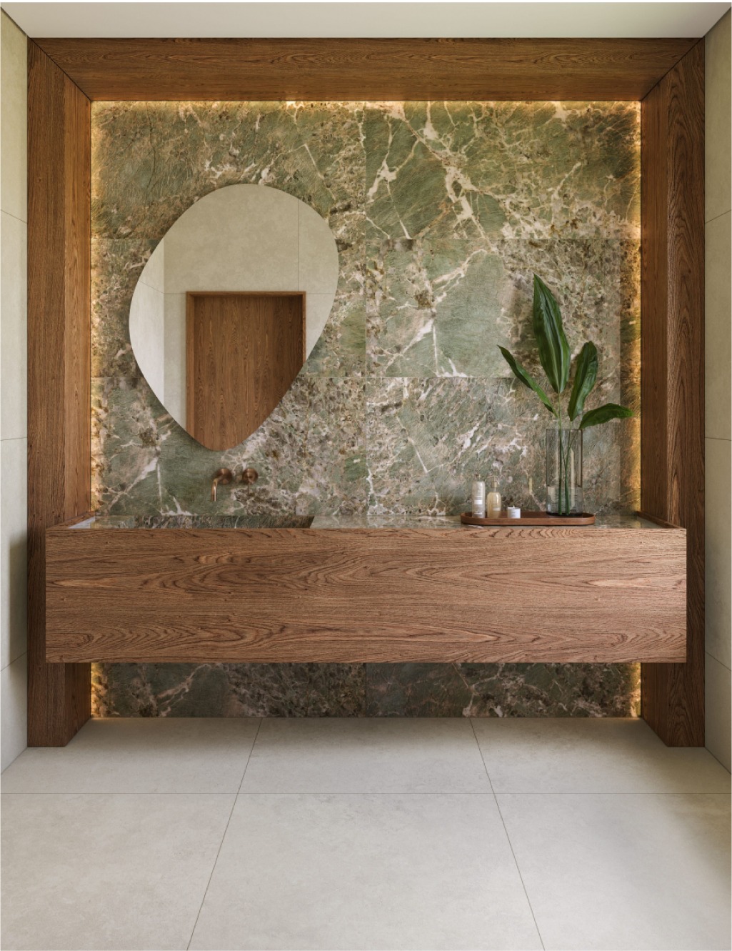 Inspired by Amazonite stone, the Jaderevela series showcases the beauty of green marble in a bold and striking design. Its veins are arranged in a natural, uncontrived manner, creating movement and depth. The subtle sheen transforms spaces, lending them a charming and captivating finish.